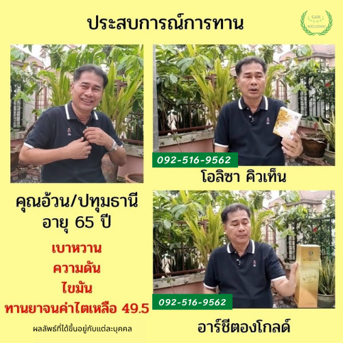 คุณอ้วน เริ่มเป็นเบาหวาน ตั้งแต่ อายุ 50 และต้องทานยา เบาหวาน ความดัน ไขมัน ต่อเนื่อง จน ค่าไตเหลือ 49.5 เปอเซ็นกลัวว่าต้องฟอกไต จึ่งเริ่มทดลองทาน โอลิซา คิวเท็น และ อาร์ชีตองโกลด์ ทาน โอลิซา คิวเท็น ได้ 2 กล่อง อาการเวียนศรีษะลดลง และผิวคล้ำๆที่เท้า ผิวเริ่มสีเสมอส่วนอื่น ประทับใจมั่นใจครับ